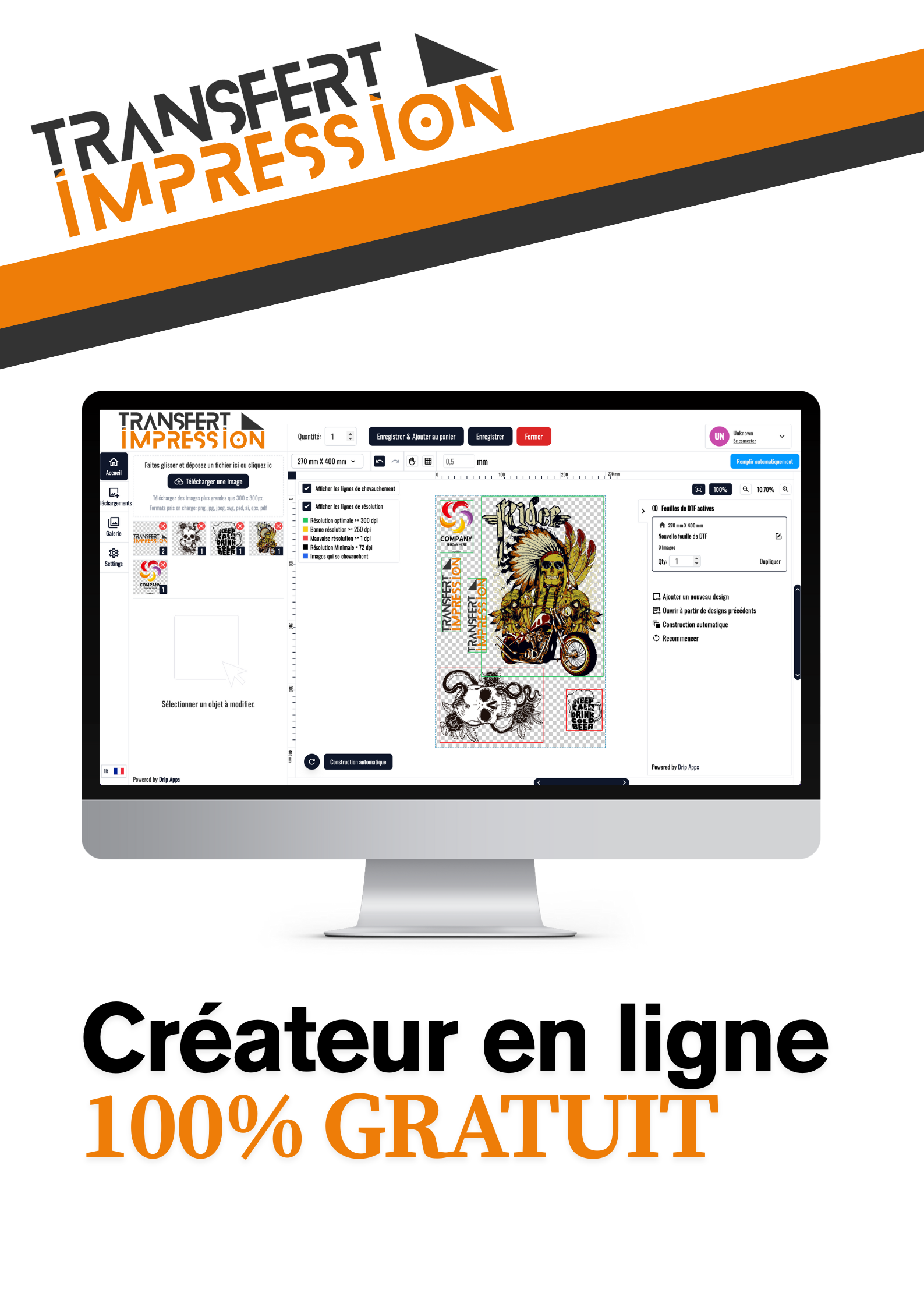 Du fichier au textile, passez commande en 3 clics et recevez des transferts prêts à presser qui font la différence sur t-shirts, sweats, tote bags, casquettes et goodies, sans surprise, sans prise de tête.